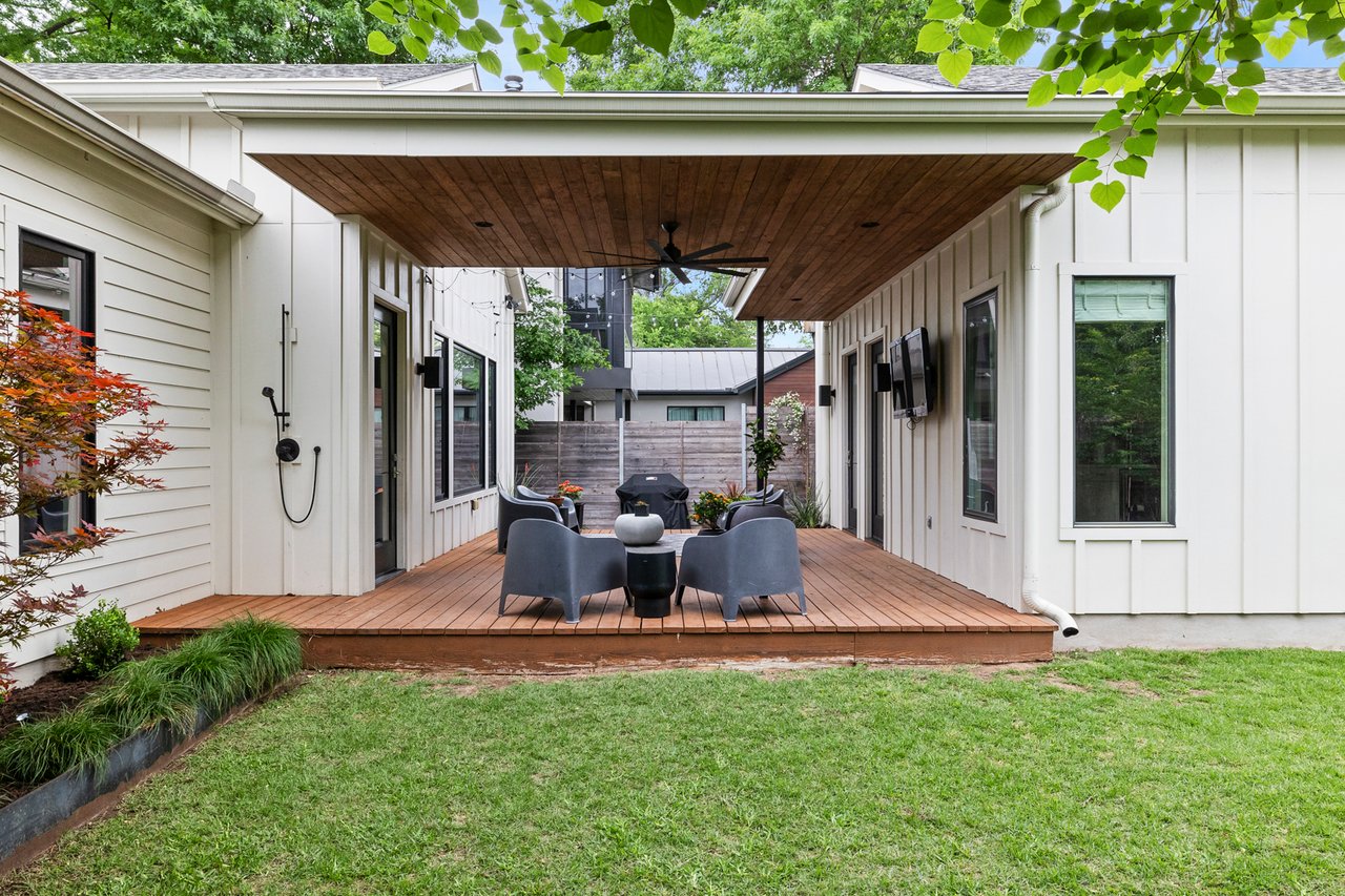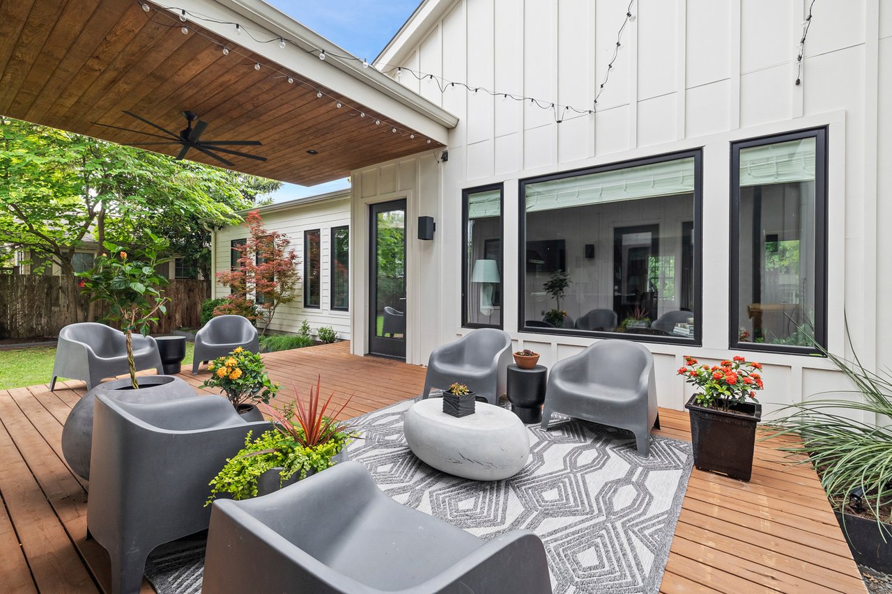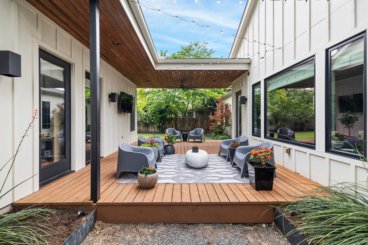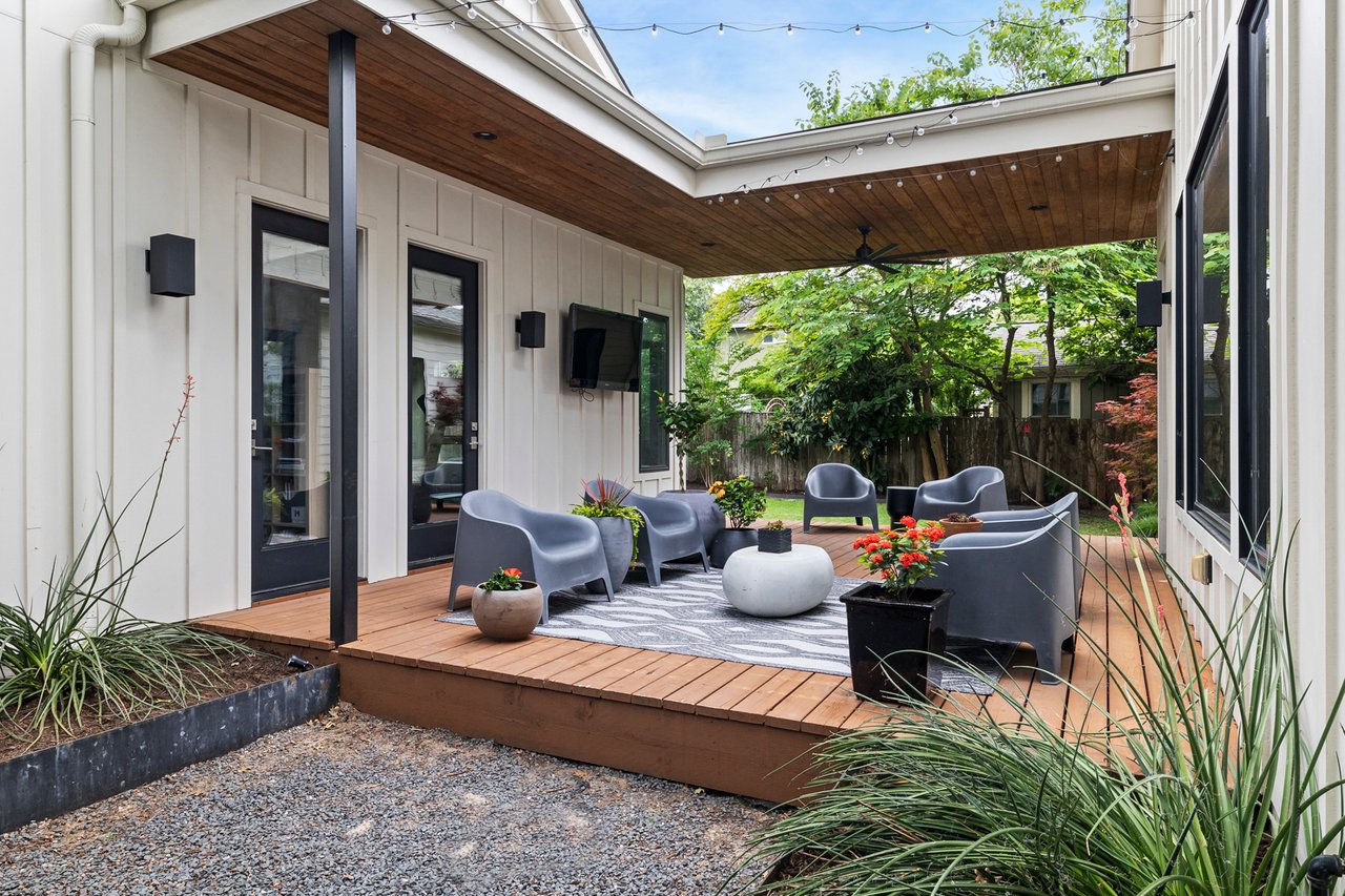 Outdoors, a private deck and thoughtfully designed living space connect the main house to the detached casita, creating a tranquil setting for relaxing or hosting guests year-round.